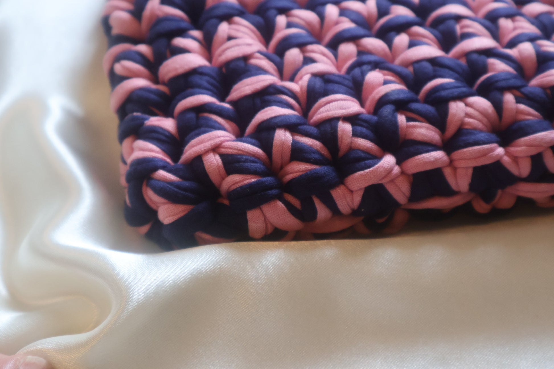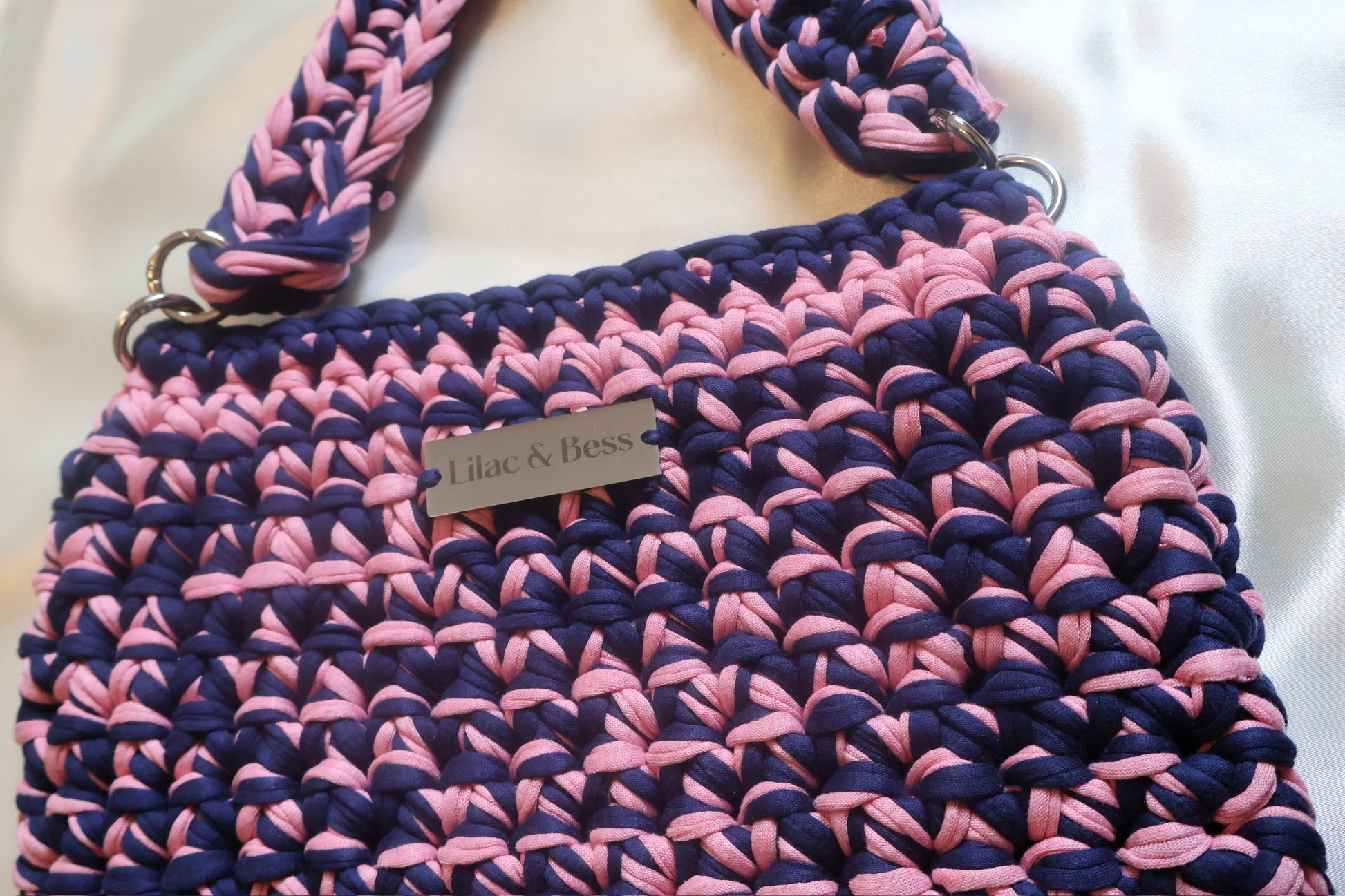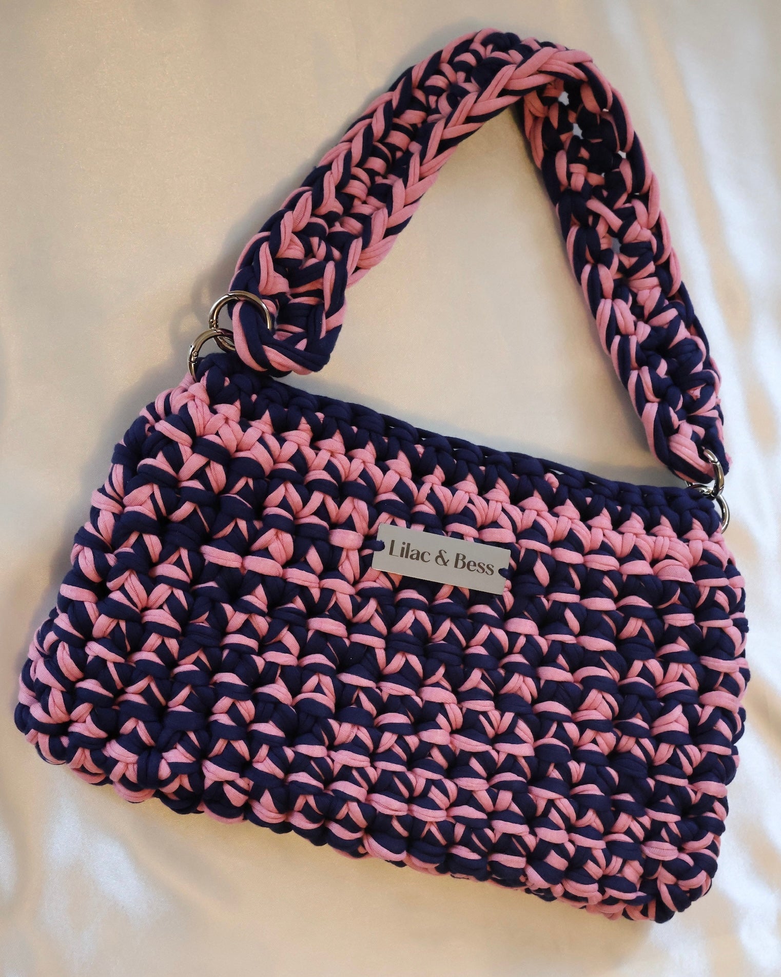 Say hello to your new favourite sidekick – The Bubblegum Crochet Handbag! Handcrafted from soft, chunky recycled t-shirt yarn in pink and blue, this one-of-a-kind beauty is made to turn heads and carry your essentials in style.