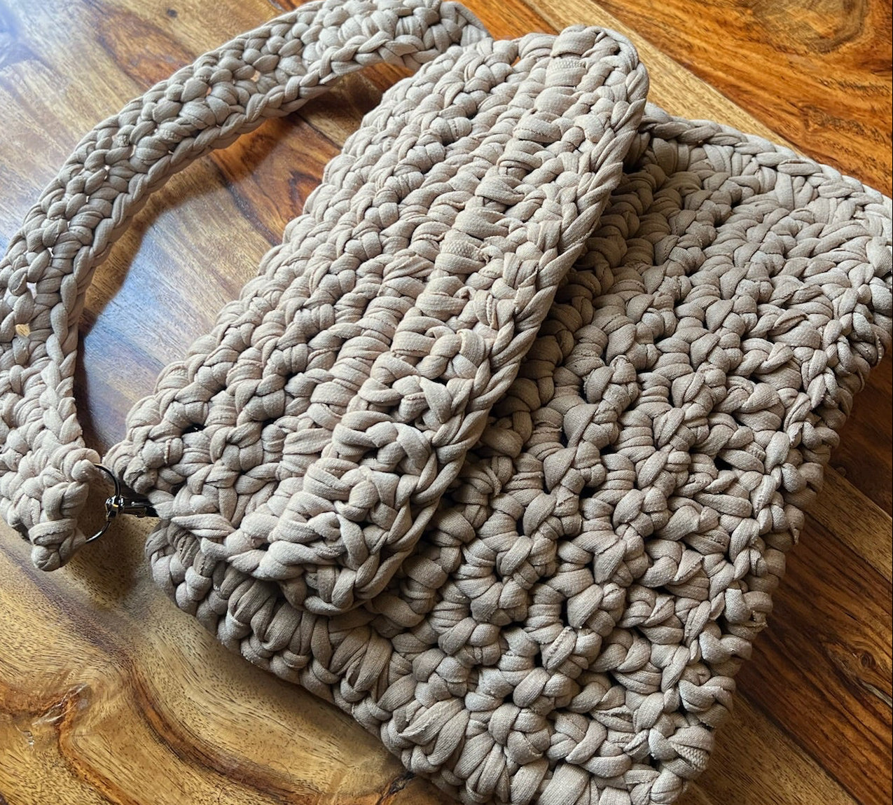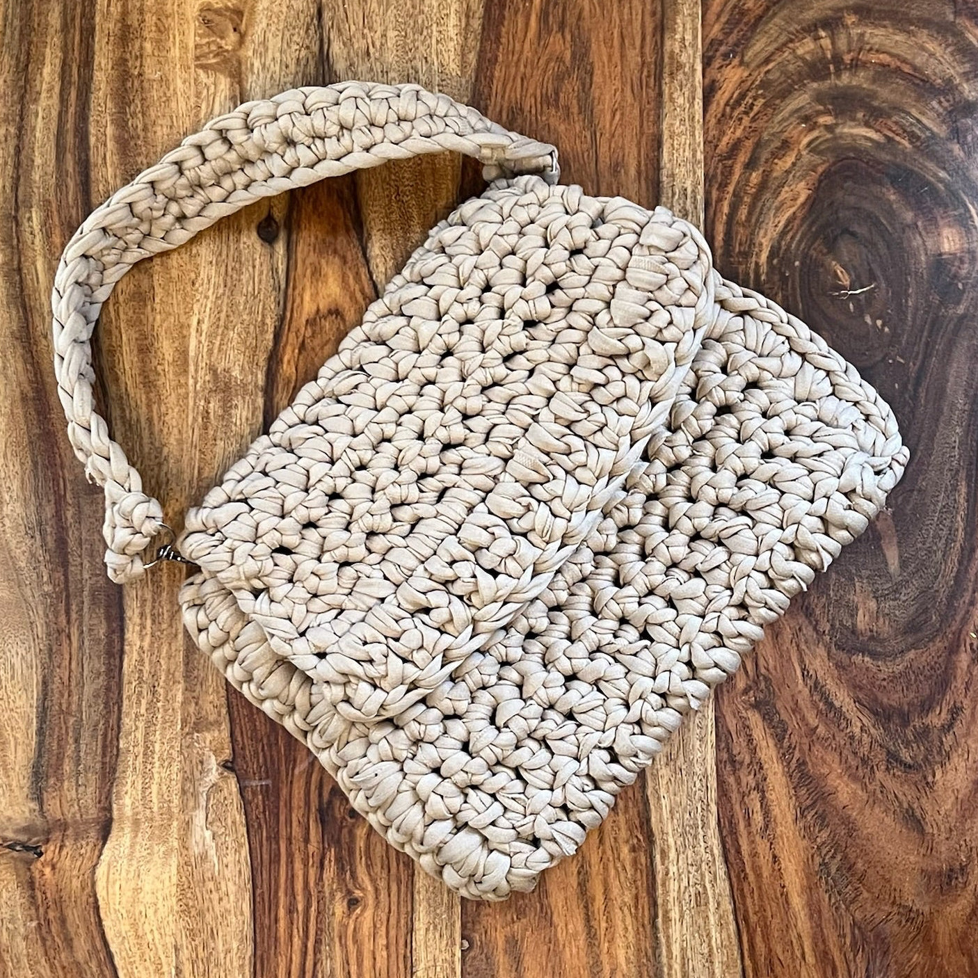 Say hello to your new favourite sidekick – The Sandstone Crochet Handbag! Handcrafted from soft, chunky recycled t-shirt yarn in a neutral beige, this one-of-a-kind beauty is made to turn heads and carry your essentials in style.